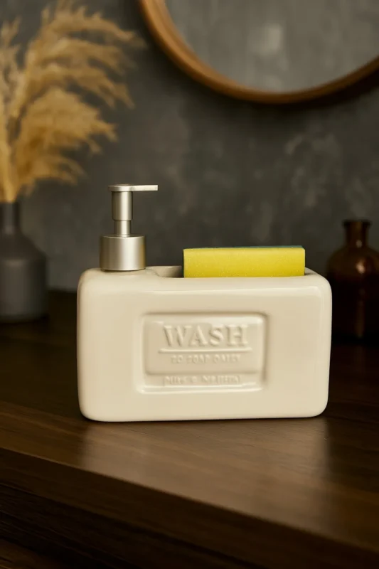 Şık ve Fonksiyonel Seramik Süngerlikli Sıvı Sabunluk/Deterjanlık, Krem, 500 ml