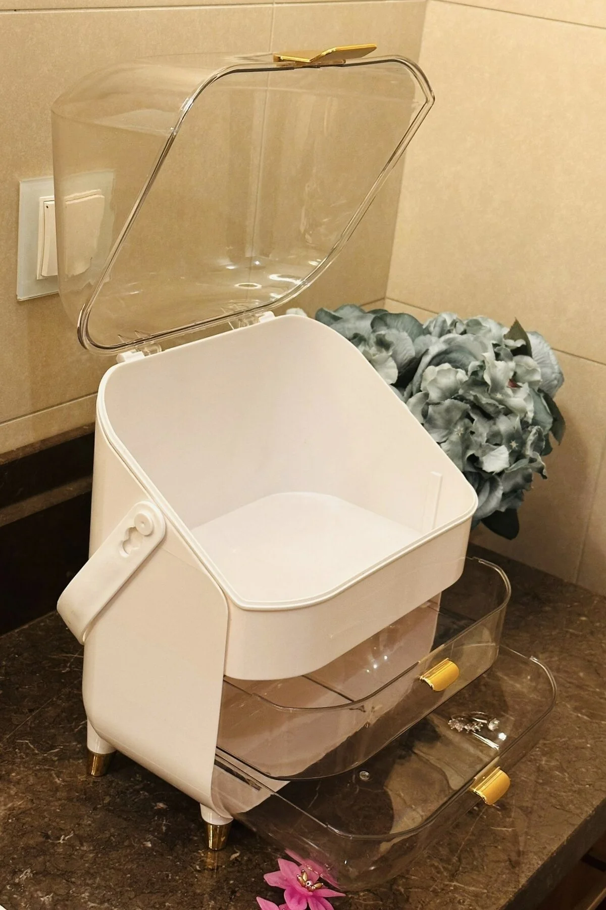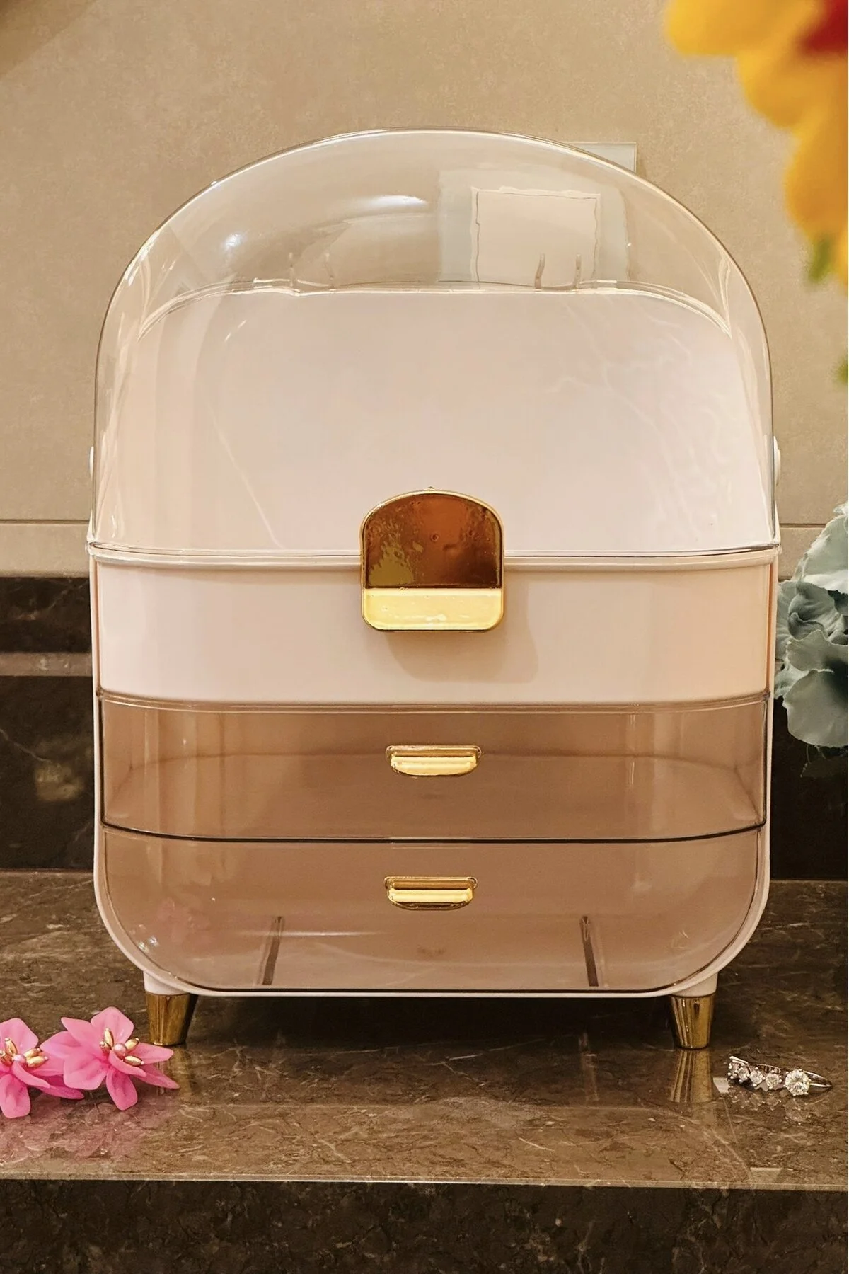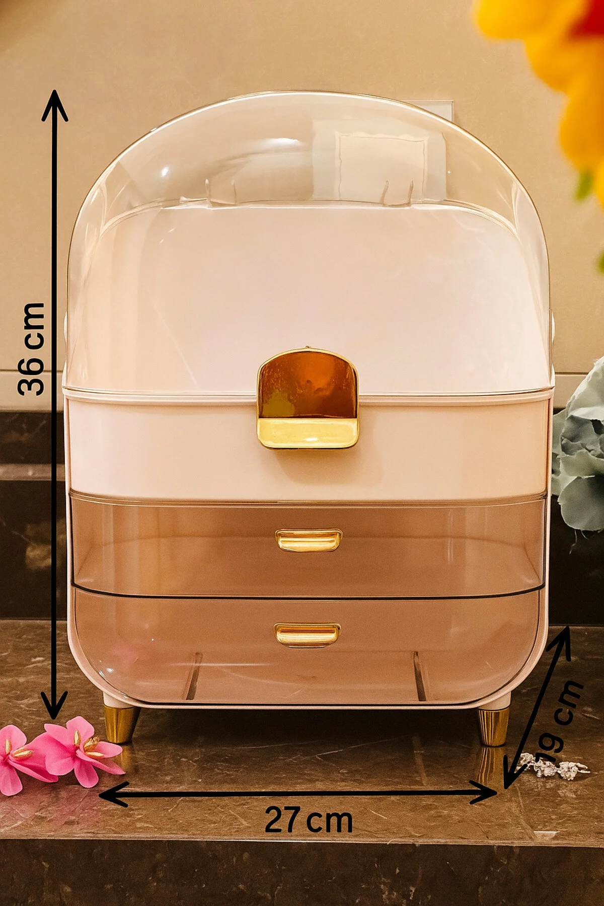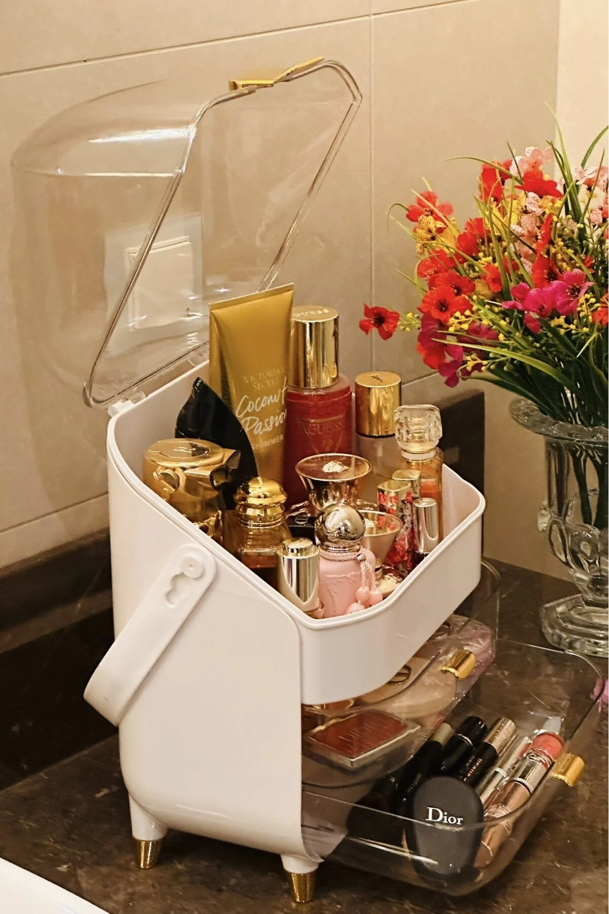 ✨ Şeffaf üst kapağı sayesinde ürünlerinizi tozdan korur, altın detaylı kulplarıyla şık bir görünüm kazandırır.